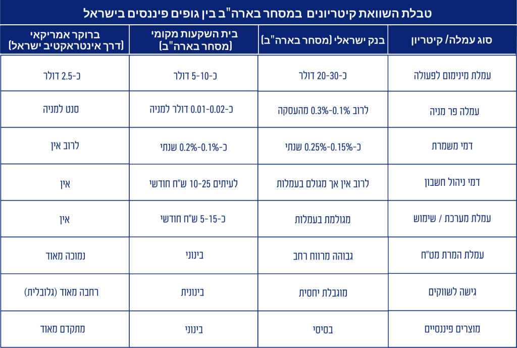 הטבלה הזו ממחישה בצורה ברורה כי במסחר בחו"ל, ובעיקר בארה"ב, הפערים אינם רק "כמה דולרים לפעולה" אלא מבנה עלויות שלם. משקיע שמבצע פעולות חודשיות או חוסך באופן שוטף, מושפע בעיקר מעמלות מינימום ומהמרות מט"ח – ושם הפערים הופכים לדרמטיים.
