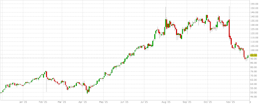 גרף מניית רובלוקס בשנה החולפת (לפי 27/11/2025)